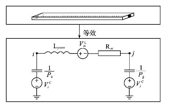 J.Ekman提出了基于寄生參數(shù)矩陣的等效電路的建立方法,即把所有互感、互容等效成受控的電壓源,與自感、自容連接(相當于把所有互感、互容對電路的影響等效到受控電壓源上),從而建立等效電路模型。圖4所示為任意兩個節(jié)點間的等效電路模型。