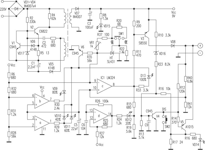如果是為鎳鎘、鎳氫電池充電,由于這類電池存在一定的記憶效應(yīng),需不定時(shí)對(duì)其進(jìn)行放電。SW1是鎳鎘、鎳氫、鋰離子電池充電轉(zhuǎn)換開關(guān)。SW1與精密基準(zhǔn)電源SL431為運(yùn)放LM324 ⑨提供兩個(gè)不同的精密基準(zhǔn)源,由SW1切換。在給鎳鎘、鎳氫電池充電時(shí),LM324 ⑨腳的基準(zhǔn)電壓約0.09V(空載);在給鋰離子電池充電時(shí),LM324 ⑨腳的基準(zhǔn)電壓約為0.08V(空載),這種設(shè)計(jì)是由這兩種類型電池特有的化學(xué)特性決定的。按下SW2,V5基極瞬間得一低電平而導(dǎo)通,可充電池上的殘余電壓通過V5的e c極在R17上放電,同時(shí)放電指示燈VD14點(diǎn)亮。在按下SW2后會(huì)隨即釋放,這時(shí)可充電池上的殘余電壓通過R16、R13分壓,C9濾波后為V4的基極提供一個(gè)高電平,V4導(dǎo)通,這相當(dāng)于短接SW2。隨著放電時(shí)間的延長(zhǎng),可充電池上的殘余電壓也越來越低,當(dāng)V4基極上的電壓不能維持其繼續(xù)導(dǎo)通時(shí),V4截止,放電終止,充電器隨即轉(zhuǎn)入充電狀態(tài)。