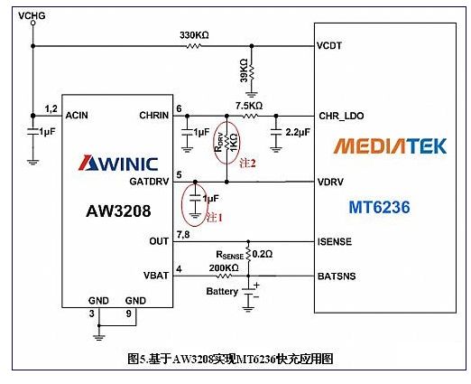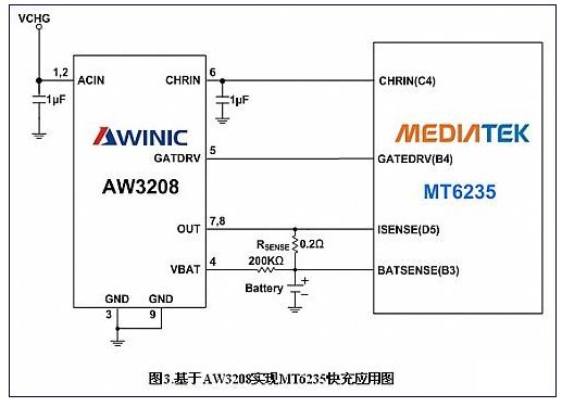 上海艾為電子專門針對MT6235/36平臺推出的AW3208在增加OVP功能的同時,提供了智能充電功能,以滿足快速充電的功能。如圖2所示,AW3208內(nèi)置專有的K-ChargeTM技術(shù),可根據(jù)芯片溫度智能調(diào)整輸出電流,以保證在充電期間整個充電系統(tǒng)的安全。使得手機在實現(xiàn)快速充電的時候不會因為由于環(huán)境溫度較高或者充電電流過大導致芯片進入過溫保護使得充電沒法正常進行。圖3為在MT6235上的典型應用圖。