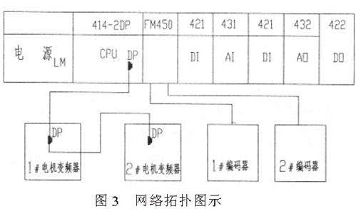 采用PLC 與變頻器控制方法, 實現(xiàn)多個分散驅(qū)動電機同步運行。PLC 采用西門子S7400 系列, 圖3為網(wǎng)絡(luò)拓撲圖。