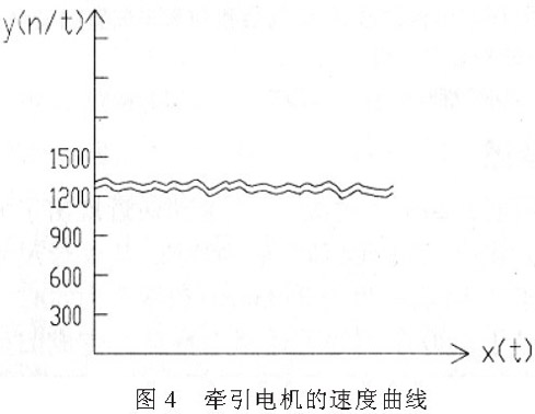 利用 STEP7 編制PLC 上位機監(jiān)控程序,Wincc采集速度值并繪制曲線。數(shù)據(jù)提取的時間間隔為15ms。實際上牽引電機1 和牽引電機2 速度是相同的, 但為了反映牽引電機2 的跟蹤和波動情況, 在此特地將其分開, 上面是牽引電機1 的速度曲線, 下面是牽引電機2 的速度曲線(見圖4) 。牽引電機1 的速度發(fā)生變化時, 牽引電機2 就能及時地響應, 進行跟蹤, 并且能很快地達到穩(wěn)定。實驗表明, 采用PLC 和變頻器的控制方法, 能達到較高的同步要求, 響應快、速度波動幅度較小。