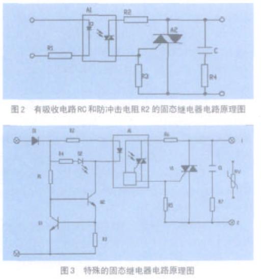 圖1、圖2 和圖3 三種電路都能實(shí)現(xiàn)固態(tài)繼電器的功能。圖1 是固態(tài)繼電器最簡(jiǎn)單的電路原理圖,圖中A1 是交流光耦,A 2 是雙向可控硅。常用在小型的S S R ,使用時(shí),用戶往往在外面增加器件來改善性能。圖2 是在圖1 的基礎(chǔ)上增加了RC 吸收電路和防沖擊電阻R2 。R 2是保護(hù)光耦,抑制在導(dǎo)通瞬間流過光耦的沖擊電流。附加這些器件后,大大改善了SSR 的EMC 特性和浪涌對(duì)光耦的沖擊性能。因此該電路常用在可靠性較高的場(chǎng)合。圖3 是一種特殊的電路,常用在高可靠性和E M C 等級(jí)較高的SSR 設(shè)計(jì)中。圖中的二極管D1 可防止輸入反極性。由Q1、Q2、R1 及R3 組成恒流電路,保證當(dāng)輸入電壓變化時(shí),光耦A(yù) 1 的電流恒定。R C 電路C 1 、R 7 和R 6 的功能與圖2 的相同。該電路還增加了壓敏電阻R V 。R V不僅加強(qiáng)了S S R 的過壓保護(hù)能力,而且大大改善了其E M C 性能。