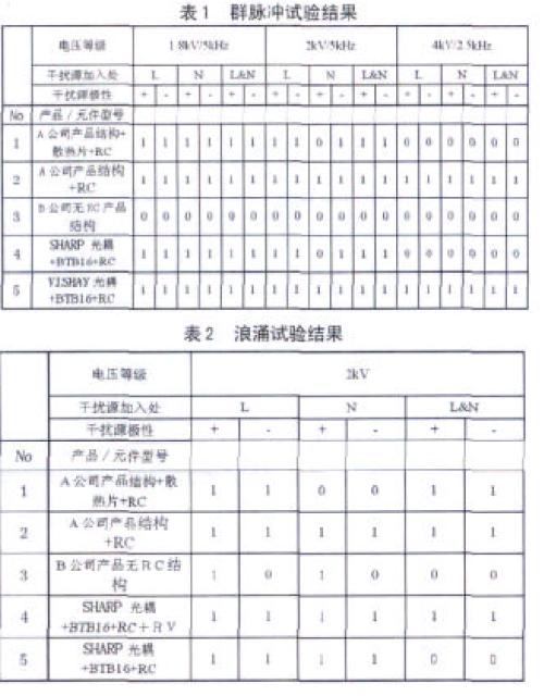 采用不同的樣品(見下)進(jìn)行以下兩種試驗(yàn):群脈沖試驗(yàn)(見表1)和浪涌試驗(yàn)(見表2)。