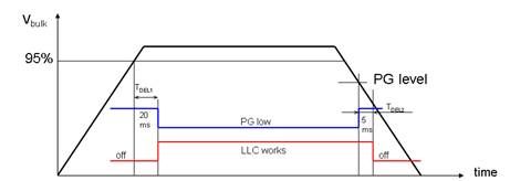 NCP1910的工作序列如圖3所示,如果PFC未就緒,LLC就不能啟動;一旦PFC就緒,就會開始一段20 ms的延遲;延遲結(jié)束后PGout引腳假定為低電平,LLC可以開始工作。在撥除交流輸入關(guān)閉電源時Vbulk降低,到達PG信號時,PGout引腳被釋放(開路);如果Vbulk到達LLC停止電平,LLC停止工作;或者如果Vbulk緩慢下降,如處在輕載狀態(tài),LLC會在PGout引腳被釋放5 ms后停止工作。