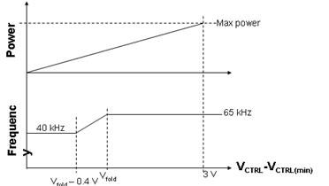 VCTRL與功率及頻率的關(guān)系:當輸出功率下降時,VCTRL隨之下降;當?shù)竭_反走設(shè)定點時,頻率線性下降;65 kHz版本將最小頻率內(nèi)部設(shè)定為40 kHz。