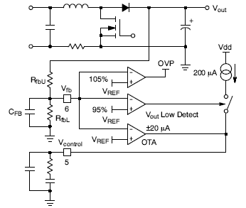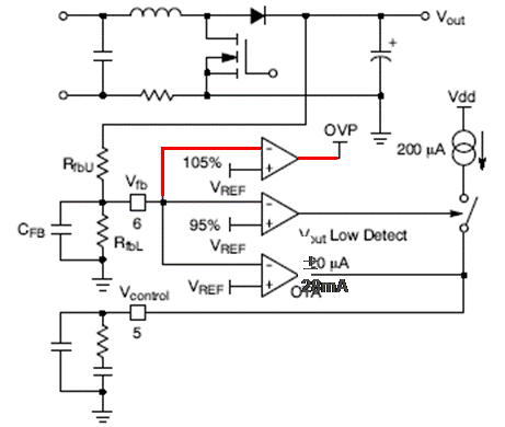 2. 快速瞬態(tài)響應(yīng)/過壓保護(OVP):當VFB > 105% VPREF時,過壓保護激活,驅(qū)動器輸出變?yōu)榈碗娖?;當VFB低于103.2% VPREF時,器件自動恢復(fù)工作。