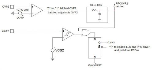 3. 冗余OVP(閂鎖):專用OVP2引腳用來保護大電容;電路中內(nèi)置的20 µs濾波器用來提供更佳的噪聲免疫性。當OVP2比較器被觸發(fā)時,PFC及LLC均關(guān)閉。PFCok信號假定為低電平時,PGout被釋放開路,使LLC停止工作。