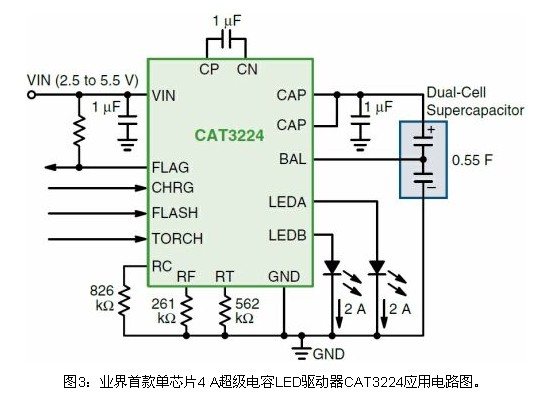 CAT3224則是業(yè)界首款4 A單芯片超級電容LED驅(qū)動器(見圖3),集成了雙模1x/2x電荷泵,提供三項(xiàng)關(guān)鍵功能:精密的超級電容充電控制、電流放電至LED閃光的管理,以及為LED手電筒模式提供恒流。這三種模式的工作電流能以3顆外部電阻作簡易編程,能吸收達(dá)4 A的LED閃光脈沖電流。超級電容技術(shù)的高峰值電流優(yōu)勢,結(jié)合CAT3224簡單的并行邏輯接口,使這器件成為采用LED替代氙氣燈的應(yīng)用的極佳選擇。