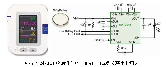 如今,越來越多的創(chuàng)新型便攜設(shè)備采用扣式電池(coin cell)供電,如醫(yī)療應(yīng)用中的血糖儀、數(shù)字體溫計(jì)、血氧計(jì)、呼吸分析儀和生理監(jiān)測儀等。由于這種電池的獨(dú)特特性以及需要長工作壽命,這些緊湊型應(yīng)用需要定制的LED驅(qū)動器,不僅要管理背光,還要監(jiān)測電池電量。在這類應(yīng)用中,可以采用安森美半導(dǎo)體計(jì)劃于2010年下半年推出的CAT3661 2至2.5 V單LED驅(qū)動器。這器件同樣采用安森美半導(dǎo)體專利的四模(Quad Mode)電荷泵架構(gòu),能效高達(dá)92%,靜態(tài)電流低至約150 μA,提供可調(diào)節(jié)的低電池電量檢測功能,以及強(qiáng)固的LED故障監(jiān)測、軟啟動和短路限制等保護(hù)功能,采用低高度的3 x 3 mm TQFN-16封裝,非常適合這些便攜設(shè)備應(yīng)用。