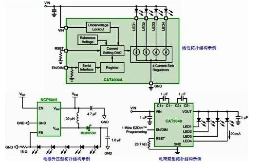 白光LED廣泛用于小型液晶顯示器(LCD)面板及鍵盤背光以及指示器應(yīng)用。高亮度LED則用于手機(jī)和數(shù)碼相機(jī)的閃光光源。這些應(yīng)用需要優(yōu)化的驅(qū)動器解決方案,能夠延長電池使用時間、減小印制電路板(PCB)面積及高度。在這些應(yīng)用領(lǐng)域,常見的LED驅(qū)動器方案涉及線性、電感型或電荷泵型不同拓?fù)浣Y(jié)構(gòu),各有其特點(diǎn)。例如,電感型方案總能效最佳;電荷泵方案由于使用低高度陶瓷電容,占用的電路板面積和高度極??;線性方案非常適合色彩指示器以及簡單的背光應(yīng)用。安森美半導(dǎo)體提供所有這三種類型拓?fù)浣Y(jié)構(gòu)的LED驅(qū)動器方案(參見圖1),滿足用戶不同的應(yīng)用需求。