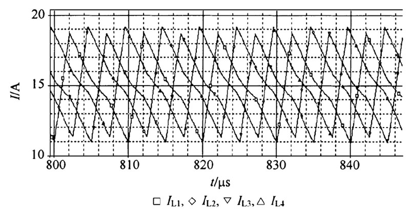 圖6 所示為濾波電感的電流波形, 從圖6 可以看出, 4 個(gè)濾波電感的電流輪流充電, 如果一個(gè)濾波電感在充電, 其余3 個(gè)電感必須在放電, 在死區(qū)時(shí)間內(nèi), 4 個(gè)濾波電感都在放電。