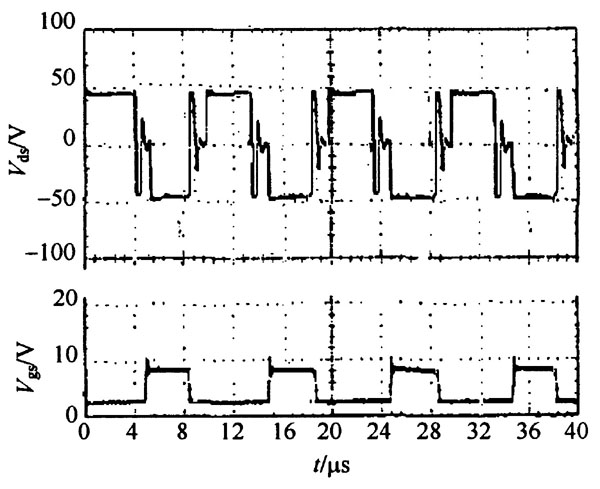 通過理論研究及仿真分析, 可以看出, 交錯(cuò)并聯(lián)的低壓大電流DC - DC 變換器具有良好的性能,在輸出為1125 V/ 60 A 的情況下, 輸出電流紋波可以降到很小。為了進(jìn)一步說明這種拓?fù)浣Y(jié)構(gòu)的可行性, 用實(shí)驗(yàn)結(jié)果驗(yàn)證。實(shí)驗(yàn)電路見圖4 , 實(shí)驗(yàn)參數(shù)和仿真相同, 最后得到如圖9 所示的實(shí)驗(yàn)波形。圖9 中, V gs為一次側(cè)一個(gè)MOSFET 的門極驅(qū)動電壓波形, V ds則為相應(yīng)的MOSFET 的柵源電壓波形,從圖9 可以看出, 實(shí)驗(yàn)結(jié)果所得波形同圖5 的理論分析結(jié)果十分吻合, 所提出的方法是可行的。其中, 變壓器選用R2 KB 軟磁鐵氧體材料制作的GU22 磁心, 原副邊的匝數(shù)分別為8 匝和1 匝; 電感選用寬恒導(dǎo)磁材料IJ 50h 制作的環(huán)形鐵心T5 - 10 - 215 ,匝數(shù)為8 匝。