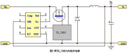 圖7示出的是采用TX_CMB3型驅動模塊的斬波電路,該驅動組件是北京落木源公司(www.pwrdriver.com)新開發(fā)出的單管隔離驅動器。該款驅動器使用變壓器隔離,采用分時技術,在輸入信號的上升和下降沿傳遞PWM的信號,在平頂階段傳遞能量,因而能夠輸出陡峭的驅動脈沖。這種驅動方法的優(yōu)點是使用方便(在MOSFET功率不大時,只要如圖7連接就可以了),驅動脈沖質量好,工作頻率高,體積較小,輸入電壓最高可達1000V,價格也比較便宜。缺點是工作頻率低時要求的變壓器體積比較大,同時成本稍高些,但考慮到簡化了設計、并降低了裝配成本,總成本可能還要低些。