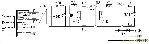 圖中VD3的作用是一個(gè)逆阻二極管,防止外部電源倒灌充電機(jī)。二極管后邊的開(kāi)關(guān)就是充電機(jī)輸出開(kāi)關(guān)。從這里出去的直流分為三路:一路去電池,一路去動(dòng)力合閘母線,另一路為控制母線提供前級(jí)電源。