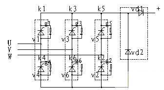 隨著現(xiàn)代集成技術(shù)的發(fā)展,功率大、體積小的可控硅模塊取代了原來(lái)的單元可控硅,一般一個(gè)橋臂是一個(gè)可控硅模塊,三個(gè)可控硅模塊組成一個(gè)三相全控橋,再加上一個(gè)有續(xù)流二極管和隔離二極管組成的二極管模塊,就組成了充電機(jī)的整流部分(見(jiàn)圖2),虛線框內(nèi)表示為一個(gè)模塊。照下面的接線方式,可控硅的觸發(fā)順序?yàn)閂1、V2、V3、V4、V5、V6。