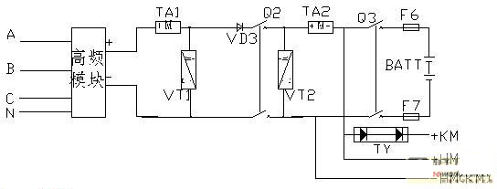 ⑴ 由于高頻模塊具有良好的輸入過(guò)欠壓和輸出過(guò)欠壓保護(hù),而且具有良好的限流功能,因此,在輸入側(cè)和輸出側(cè)不需另加熔斷器保護(hù)。由于高頻模塊本身具有電壓電流顯示功能,而且監(jiān)控器也可以顯示系統(tǒng)中的其他參數(shù),因此,在高頻系統(tǒng)中,相控系統(tǒng)中常用的表記也可以省略。