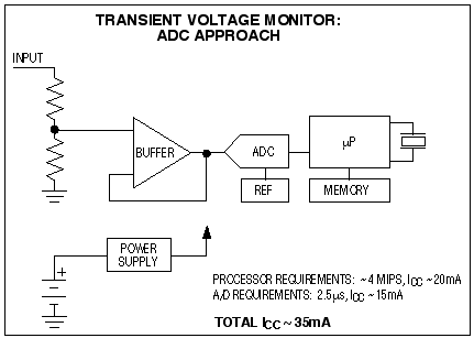 如果軟件比較具有高效編碼并且ADC無需處理器干預(yù),系統(tǒng)每次采樣可執(zhí)行少于10條指令,這就要求處理器具有4MIPS的能力。這種執(zhí)行能力并不適合采用電池供電(圖1)。需要考慮用模擬方法對輸入瞬態(tài)偏離進行響應(yīng),用以替代連續(xù)跟蹤方案。