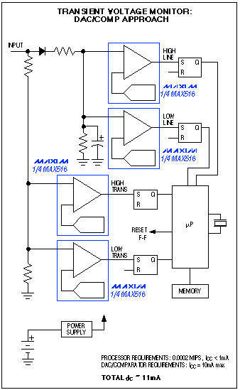 在這種情況下,DAC/比較器替代方案提供了幾個明顯優(yōu)勢。需要4個DAC和4個比較器(或一片MAX516),后面連接一個4路設(shè)置/復(fù)位觸發(fā)器。一組DAC/比較器/FF監(jiān)測高瞬態(tài)電壓,一組監(jiān)測低瞬態(tài)電壓,一組用于監(jiān)測電網(wǎng)跌落,一組用于監(jiān)測浪涌(圖2)。瞬態(tài)電壓直接耦合到比較器,連接到電壓跌落和浪涌監(jiān)測比較器的輸入首先要進行整流和濾波,以獲得電網(wǎng)電壓的平均值??稍谲浖姓{(diào)整到合適的rms.