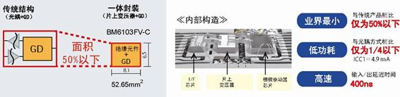 此次羅姆采用獨創(chuàng)的微細加工技術,開發(fā)出片上變壓器工藝,進而成功開發(fā)出小型并且內置了絕緣元件的柵極驅動器。無需外置零件,同時通過采用小型封裝,與傳統產品相比,安裝面積減少了約50%。不僅如此,由于內置車載逆變器電路所需的全部保護功能,不僅有助于實現逆變器的小型化,還非常有助于減輕設計負擔。