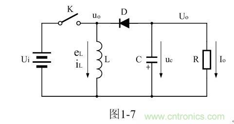 圖1-7是另一種串聯(lián)式開關(guān)電源,一般稱為反轉(zhuǎn)式串聯(lián)開關(guān)電源。這種反轉(zhuǎn)式串聯(lián)開關(guān)電源與一般串聯(lián)式開關(guān)電源的區(qū)別是,這種反轉(zhuǎn)式串聯(lián)開關(guān)電源輸出的電壓是負(fù)電壓,正好與一般串聯(lián)式開關(guān)電源輸出的正電壓極性相反;并且由于儲(chǔ)能電感L只在開關(guān)K關(guān)斷時(shí)才向負(fù)載輸出電流,因此,在相同條件下,反轉(zhuǎn)式串聯(lián)開關(guān)電源輸出的電流比串聯(lián)式開關(guān)電源輸出的電流小一倍。