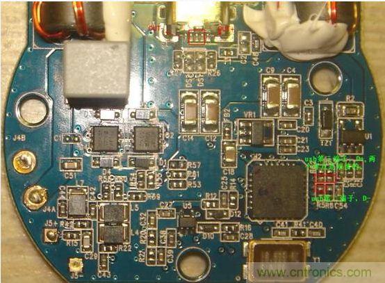 重點(diǎn)來了,點(diǎn)金石底部有三顆螺絲,撕掉那層膠墊就能看到。拆掉螺絲后,用硬物從插充電線的那個(gè)四方口可以很輕松的把底蓋撬開。然后是電路板,在micro接口那端是用膠水將電路板粘在下面的金屬塊上的,還是老辦法,用吹風(fēng)機(jī)吹熱,然后小心翹下來。要注意的是,翹電路板的時(shí)候注意別弄斷角落上兩根頭發(fā)絲那么細(xì)的線圈。其實(shí)為保險(xiǎn)起見,還如不先用烙鐵把這兩根線焊下來再拆電路板。電路板拆開可以看到一塊金屬,上面若干螺絲,拆吧。拆出金屬塊,你會(huì)發(fā)現(xiàn)金屬塊的背面粘了一塊形狀挺藝術(shù)的磁塊,用刀片切斷膠就可以弄下來了。