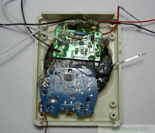 在這里我還在上蓋上鉆了兩個(gè)小孔制作了指示燈。我找了一直圓珠筆,筆桿是那種硬硬的透明的PE材料,我用電磨磨出剛好穿過小孔的細(xì)條,用打火機(jī)小心彎曲,把細(xì)條的另一端貼住電路板上的LED,將指示燈的燈光引到上蓋外面。然后用油料(橡皮泥)或者電工膠布包住led和細(xì)條,防止燈光干擾。最后用指甲銼將上蓋外突出來的筆桿銼平,用木片拋光,一切都很完美??上е谱鞯倪^程忘記照相了,還好下文可以看到做好的效果。