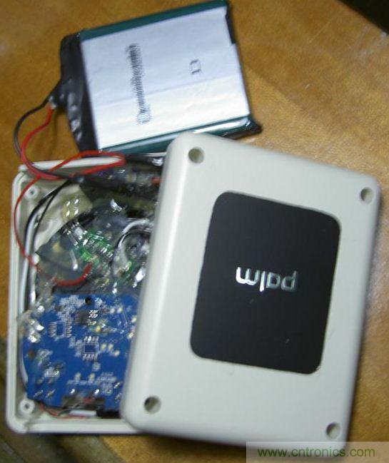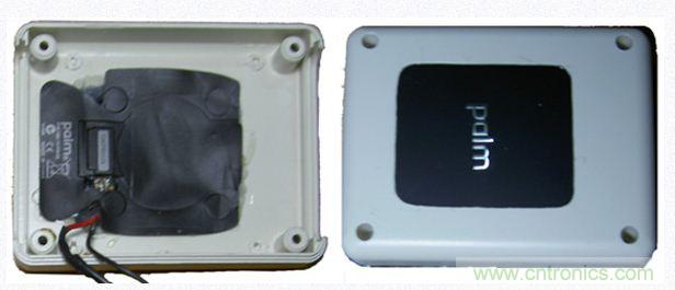 由于點(diǎn)金石表面是有一定凹陷下去的,非常契合palm的后蓋,而這個(gè)凹陷實(shí)在難以加工。另外,點(diǎn)金石里那圈非常細(xì)的線圈也是用膠水粘在外殼上的,比較難取下來。而且點(diǎn)金石上那個(gè)“plam”的金屬字也比較酷,因此于是我決定將點(diǎn)金石嵌入到移動(dòng)電源中。