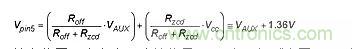 然后,施加在引腳5上的電壓就為偏置。事實(shí)上,這就像是VAUX電壓與減小了1.36V的ZCD閾值比較。這樣一來(lái),新的實(shí)際ZCD閾值就是: