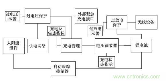 現(xiàn)有的光伏電池,單體的輸出電壓都很低(在1V 以下) ,本設(shè)計(jì)中,將多個(gè)光伏電池相串聯(lián),組成太陽能組件。通過可以自動(dòng)調(diào)節(jié)占空比的供電網(wǎng)絡(luò)保證在光照強(qiáng)度變化和負(fù)載變化時(shí),輸出電壓基本穩(wěn)定,為充電管理芯片提供穩(wěn)定的電壓輸入。通過對(duì)供電網(wǎng)絡(luò)的副邊電壓監(jiān)測(cè),保護(hù)充電管理芯片不因電壓過高而損壞。通過對(duì)電池兩端的電壓監(jiān)測(cè),保證鋰電池不會(huì)因過放電而損壞。由于無線示功儀及其中繼網(wǎng)絡(luò)節(jié)點(diǎn)的供電要求是313V,采用低噪聲、高速度的CMOS型電壓調(diào)節(jié)器。在自動(dòng)跟蹤控制器作用下,始終保持全天候跟蹤太陽。為了防止因連續(xù)陰雨天而導(dǎo)致的太陽能供電不足,設(shè)計(jì)應(yīng)急充電電路,充電期間,無線示功儀及其節(jié)點(diǎn)正常運(yùn)行。具體系統(tǒng)設(shè)計(jì)模塊如圖1 所示。
