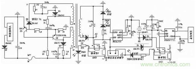 變壓器T1 的122 繞組加至開關(guān)管Q1的集電極( c) ,另一路經(jīng)過R1 為Q1 提供基極電壓。當(dāng)基極( b)的電壓為高電平時(shí), Q1 開始導(dǎo)通,變壓器T1 的122 繞組中產(chǎn)生1 正2 負(fù)的電動(dòng)勢(shì),經(jīng)T1 耦合,在T1 的324 繞組中產(chǎn)生3 正4 負(fù)的感應(yīng)電動(dòng)勢(shì),此電動(dòng)勢(shì)經(jīng)R5 ,C2 疊加到Q1 的基極( b) ,使Q1 迅速飽和導(dǎo)通。由于變壓器T1 的122 間的電流不能突變,在此過程中會(huì)產(chǎn)生1 負(fù)2 正的電動(dòng)勢(shì)。變壓器T1 的324 繞組中感應(yīng)出3 負(fù)4 正的電動(dòng)勢(shì),通過R5 , C2 ,使Q1 迅速進(jìn)入截止?fàn)顟B(tài)。經(jīng)R1 對(duì)C2 的不斷充電, Q1 又開始導(dǎo)通,進(jìn)入下一輪的開關(guān)振蕩狀態(tài)。在導(dǎo)通期間, T1 變壓器的副邊繞組526,經(jīng)整流二極管D4 向外輸送能量。