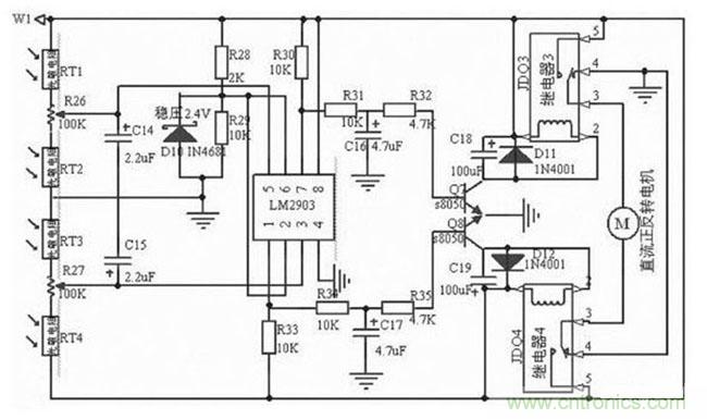 控制器的輸入端,光敏傳感器分別由兩只光敏電阻串聯(lián)交叉組合而成。每一組兩只光敏電阻中的一只為比較器的上偏置電阻,另一只為下偏置電阻。一只檢測(cè)太陽光照,另一只則檢測(cè)環(huán)境光照,送至比較器輸入端的比較電平始終為兩者光照之差。具體電路如圖4 所示:光敏電阻RT1 , RT2 與電位器R27 和光敏電阻RT3 , RT4 與電位器R28 分別構(gòu)成光敏傳感電路。將RT1 和RT3 安裝在垂直遮陽板的一側(cè), RT4 和RT2 安裝在另一側(cè)。當(dāng)RT1 , RT2 , RT3 和RT4 同時(shí)受環(huán)境自然光線作用時(shí),R27 和R28 的中心點(diǎn)電壓不變。當(dāng)只有RT1 ,RT3 受太陽光照射, RT1 的內(nèi)阻減小, LM 2903 的5 腳電位升高, 7 腳輸出高電平, 三極管Q7 導(dǎo)通,JDQ 4 工作,其觸點(diǎn)3, 5 閉合。同時(shí)RT3 內(nèi)阻減小, LM 2903 的3 腳電位下降, JDQ 5 不工作,電機(jī)M 正轉(zhuǎn);當(dāng)只有RT2 , RT4受太陽光照射,同理,電機(jī)M 反轉(zhuǎn)。當(dāng)轉(zhuǎn)到垂直遮陽板兩側(cè)的光照度相同時(shí),JDQ 4, JDQ 5 都導(dǎo)通,電機(jī)M 才停轉(zhuǎn)。在太陽不停地偏移過程中,垂直遮陽板兩側(cè)光照度的強(qiáng)弱不斷地交替變化,電機(jī)不停的運(yùn)動(dòng),使太陽能接收裝置始終面朝太陽。