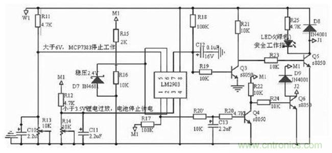 當(dāng)鋰電池電壓低于315V 時(shí),即電池電量釋放92%以上時(shí),認(rèn)為不能繼續(xù)放電,否則鋰電池內(nèi)部介質(zhì)會(huì)發(fā)生變化,致使充電特性變壞,容量降低等。為此設(shè)計(jì)過放電保護(hù)控制電路,此電路的具體設(shè)計(jì)如圖3,分析如下:采用了LM 2903的1,2,3 腳組成的一路比較器,與外圍器件構(gòu)成過放電壓比較器,R12 , R14分壓后接至LM 2093 的3 腳。當(dāng)電壓值小于315V 時(shí),分壓值小于214V,LM 2903的1 腳由高電平轉(zhuǎn)變?yōu)榈碗娖剑?Q4 由導(dǎo)通轉(zhuǎn)變?yōu)榻刂範(fàn)顟B(tài), Q6 飽和導(dǎo)通,JDQ2 工作,同時(shí)過放紅色指示燈亮。