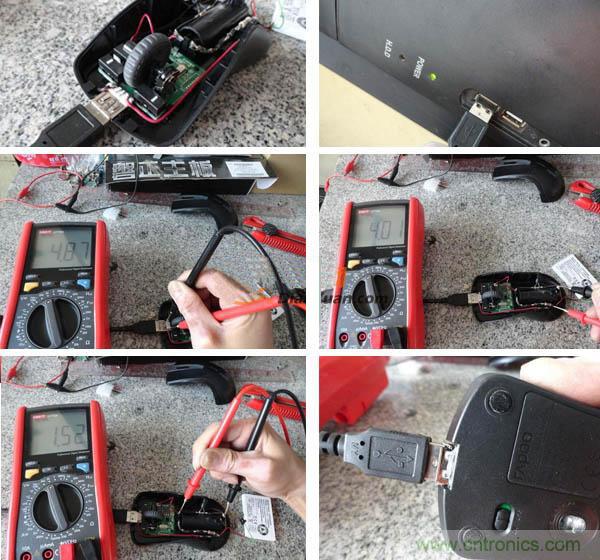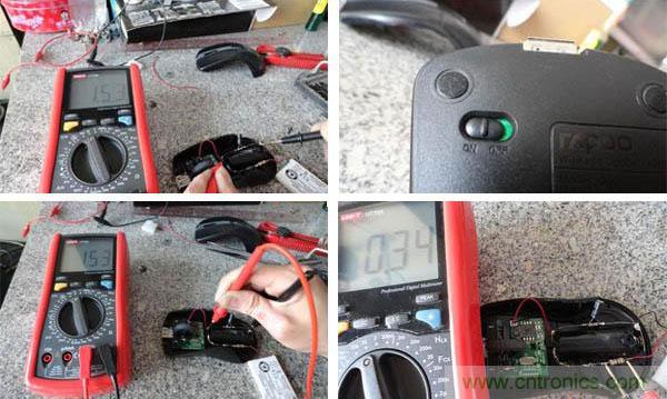 在萬(wàn)用表測(cè)試后,我們能夠看到接入后USB電壓為4.87V,鋰電池兩端為4.01V。負(fù)載端為1.52V,再次打開鼠標(biāo)電源開關(guān)。出現(xiàn)1.54V,竟然還高了,這個(gè)應(yīng)該關(guān)系到阻抗和容抗問題,水平不夠,不好解釋,反正就當(dāng)它正常了。