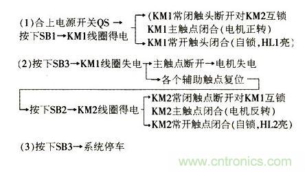 2) 檢查自鎖環(huán)節(jié)。用萬用表 R × 10 擋或 R × 100 擋,將兩表筆分別接在圖中 2 、 5 兩點,正常情況萬用表指針此時應(yīng)指在“∞”位置。萬用表指針指示正常后,手動交流接觸器 KM1 ,若萬用表指針向右偏轉(zhuǎn),說明自鎖輔助動合觸點 KM1 接線正確且動作良好.萬用表指示的電阻值為交流接觸器線圈的直流電阻。然后,松開交 流接觸器 KM1 .使萬用表指針回到“∞”位置。再手動交流接觸器 KM2 ,若萬用表指針向右偏轉(zhuǎn),說明自鎖輔助動合觸點 KM2 接線正確且動作良好。