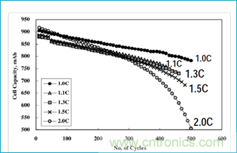 這是關(guān)于鋰離子電池充放電速率與其容量和循環(huán)壽命的關(guān)系圖,縱軸代表容量,橫軸代表循環(huán)壽命,由不同的點所描繪出來的曲線代表了用不同的速率對電池進行充放電時容量與循環(huán)壽命之間的關(guān)系。其中的C是與電池的容量有關(guān)的充放電速率數(shù)據(jù),假設(shè)某個電池的容量為1000mAH,如果用1000mA的電流對它進行充電或放電,則充滿或放完其全部電能的時間是一個小時,這時候的C就代表1000mA,2C則代表2000mA。根據(jù)這些定義,這個圖告訴我們?nèi)缦滦畔ⅲ哼@個電池的初始容量為900mAH,假如用1C即900mA的電流對它進行充放電,經(jīng)過500個循環(huán)后,其容量還剩下大約780mAH;如果用2C即1800mA的電流對它進行充放電,則經(jīng)過500個循環(huán)后,其容量會下降到大約500mAH。