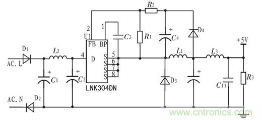 無線接收模塊由兩部分組成,供電部分由LNK304DN($0.5040)及外圍電路組成,該電路可將220 V交流電壓轉(zhuǎn)換成直流5 V電壓,分別給接收模塊和控制模塊的處理器供電,電路圖如圖3所示。
