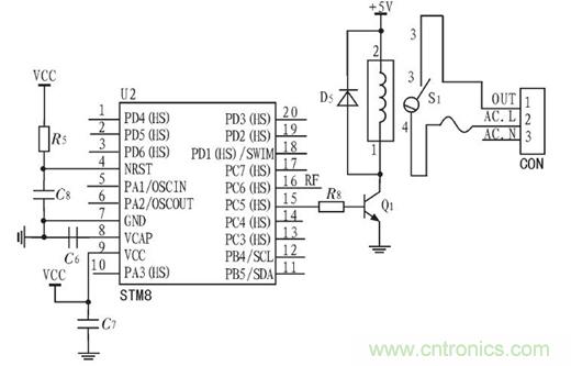 控制模塊主要由處理器單片機、繼電器和外圍元件組成開關(guān)電源,con端接入交流照明電,AC-L和AC-N分別接入交流電火線和零線,OUT端連接負載,此系統(tǒng)可以控制多路負載,實驗中該控制模塊連接了一個繼電器控制一路負載,控制模塊電路圖如圖5所示。