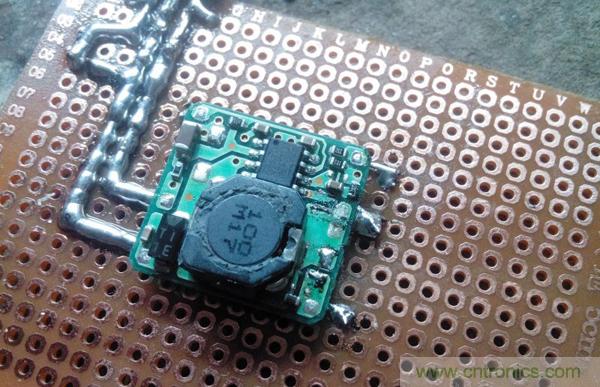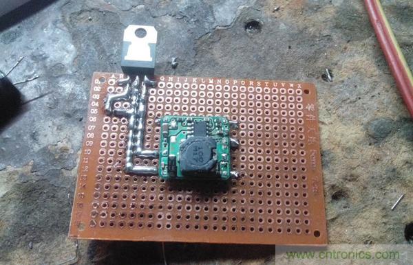 這會算是總裝前測試了,兩根白色線是模塊的軟啟動線,模塊控制腳通過100k電阻到Vcc,所以懸空都能使模塊工作,要讓它停止輸出,直接接地就好了,所以兩根線怎么接,甭說了吧,都懂得。