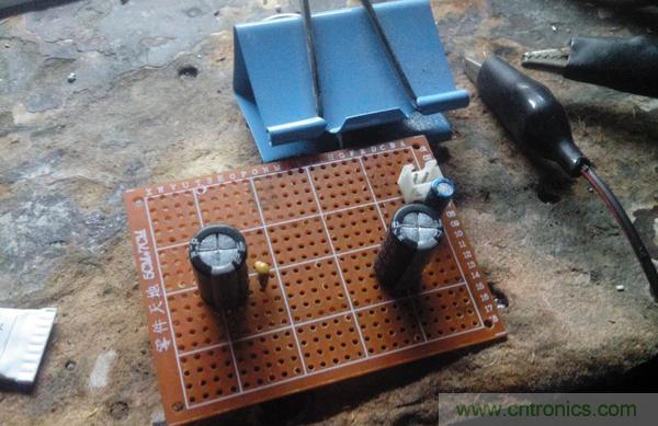 輸入輸出濾波電容以及穩(wěn)壓塊輸出插座焊接好,也有一只220uF的小電容做濾波,藍色燕尾夾是固定穩(wěn)壓塊和散熱片,用的導熱膠粘上去,發(fā)現(xiàn)要是完全固化了,摳都摳不下來。