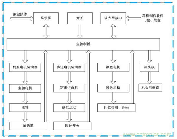 電腦繡花機的基本功能就是通過控制各電機協(xié)同配合工作,在布料上按照花樣數(shù)據(jù)形成針跡完成刺繡過程?;游募梢酝ㄟ^如軟盤、U盤等存儲介質拷貝到控制系統(tǒng)內部的存儲器中,控制系統(tǒng)根據(jù)花樣的要求來控制電機及其檢測機構,使其協(xié)同工作,完成繡花功能。繡花機工作時,主軸電機通過傳動輪帶動針桿上下運動,而X軸和Y軸的步進電機帶動著繡框在X、Y軸方向運動,刺繡品隨繡框運動,從而刺繡出圖案。當需要換色時,主控制器通過控制換色電機轉動,通過換色機構帶動換色桿移動,將穿有其它顏色線的針換上,繼續(xù)刺繡。電腦繡花機控制系統(tǒng)由主控電路和外部設備構成,控制系統(tǒng)的結構框圖如下。