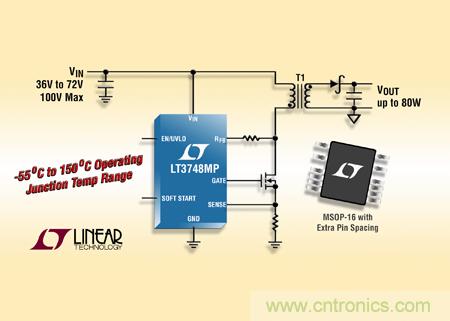 LT3748MP 的工作結(jié)溫范圍為 55°C 至 150°C,該器件采用 MSOP-16 封裝,并去掉了 4 個(gè)引腳以提供額外的高壓引腳間隔。