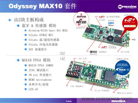 “Odyssey”開發(fā)套件是為物聯(lián)網(wǎng)應用而設計的開發(fā)與評估套件,用戶可在iOS和Andriod手機上安裝專用應用程序,直接通過藍牙接口讀寫分析數(shù)據(jù)以及遠程控制。該開發(fā)套件由一塊MAX 10 FPGA板卡和一塊藍牙及傳感器板卡組成。