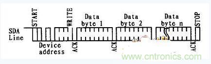 如果主設備要向EEPROM中寫數(shù)據(jù),在地址字節(jié)中主設備向EEPROM發(fā)出一個寫請求(R/W=0),發(fā)送的地址字節(jié)之后緊跟著要發(fā)送的數(shù)據(jù)。每發(fā)送一個字節(jié)的數(shù)據(jù)后EEPROM就會產(chǎn)生一個應答信號,主設備也會監(jiān)控應答信號,如果在發(fā)送一個字節(jié)后EEPROM沒有返回應答信號,則主設備就會停止發(fā)送,并生成一個結(jié)束信號。寫操作的時序如圖3所示。