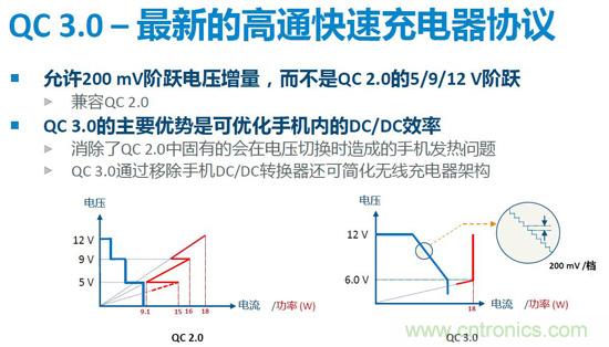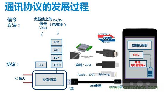 從事電源設(shè)計(jì)開發(fā)和技術(shù)支持工作超過24年的Jason分析道,從線型降壓電源開始,電源開發(fā)在摸索中前進(jìn),體積越做越小,充電方式也迎來了新的變革,現(xiàn)在的趨勢(shì)是快速充電。以前的充電器只提供一個(gè)固定的輸出電壓(5V),電源提供的輸出功率取決于輸出電流的大小,輸出電流越大則提供給電池端的功率更大,從而提高充電效率減小充電時(shí)間。但電流不能無限制的增加,因在輸出電纜的功耗隨電流的增大會(huì)相應(yīng)的增加。因而快速充電應(yīng)用應(yīng)運(yùn)而生。其實(shí)現(xiàn)方法是手機(jī)跟充電器進(jìn)行雙向通訊,電源會(huì)根據(jù)負(fù)載端發(fā)出的指令做出反應(yīng),改變其輸出電壓和電流,實(shí)現(xiàn)減小功率損耗、增大充電功率、減小充電時(shí)間的目的,從而實(shí)現(xiàn)快速充電。