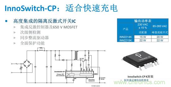 “目前PI提供兩種型號(hào)的InnoSwitch-CP器件。INN2214K IC提供15W輸出功率,適用于通用輸入電壓范圍的充電器和適配器應(yīng)用,而更大型號(hào)的INN2215K在同類應(yīng)用中可提供最大22 W的輸出功率。” Jason介紹說。
