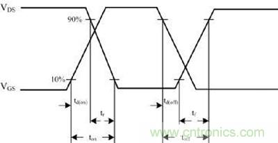 MOS管的損耗由開關(guān)損耗和驅(qū)動損耗組成,如圖1所示:開通延遲時間td(on)、上升時間tr、關(guān)斷延遲時間td(off)、下降時間tf。
