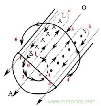 變壓器的鐵損主要由變壓器渦流損耗產(chǎn)生,如圖3所示,給線圈加載高頻電流時,在導(dǎo)體內(nèi)和導(dǎo)體外產(chǎn)生了變化的磁場垂直于電流方向(圖中1→2→3和4→5→6)。根據(jù)電磁感應(yīng)定律,變化的磁場會在導(dǎo)體內(nèi)部產(chǎn)生感應(yīng)電動勢,此電動勢在導(dǎo)體內(nèi)整個長度方向(L面和N面)產(chǎn)生渦流(a→b→c→a和d→e→f→d),則主電流和渦流在導(dǎo)體表面加強,電流趨于表面,那么,導(dǎo)線的有效交流截面積減少,導(dǎo)致導(dǎo)體交流電阻(渦流損耗系數(shù))增大,損耗加大。
