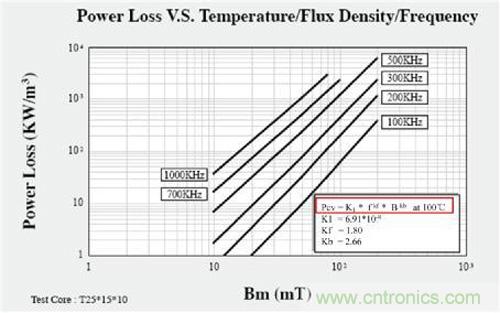如圖4所示,變壓器鐵損是和開關(guān)頻率的kf次方成正比,又與磁性溫度的限制有關(guān),所以隨著開關(guān)頻率的提高,高頻電流在線圈中流通產(chǎn)生嚴重的高頻效應(yīng),從而降低了變壓器的轉(zhuǎn)換效率,導(dǎo)致變壓器溫升高,從而限制開關(guān)頻率提高。