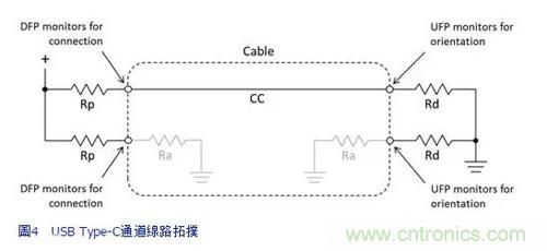 連接裝置之間的初始電力傳輸協(xié)議是透過一系列電阻器執(zhí)行,當Type-C插頭插入插座時,這些電阻器充當CC線路上的分壓器。由于插頭中的CC線路會連接至插座中的CC1或CC2,因此插座只要測量CC1和CC2線路上的電壓,即可判定插頭的方向。上拉電阻的不同數(shù)值可傳達電源能夠提供的電流量,同時可確定UFP和DFP分別是什么。電力消耗裝置沒有辦法透過不同的下拉電阻值指出其消耗的電流量,而是必須不斷地調(diào)整其負載以符合電源供應(yīng)器可提供的最大電流。