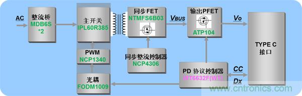 該設(shè)計主要采用安森美半導(dǎo)體的初級端高頻準(zhǔn)諧振反激式PWM控制器NCP1340、次級端同步整流控制器NCP4306、同步FET NTMFS6B03、開關(guān)FET ATP104和偉詮的PD3.0協(xié)議控制器WT6632F/WT6615F。方案框圖如圖1所示。